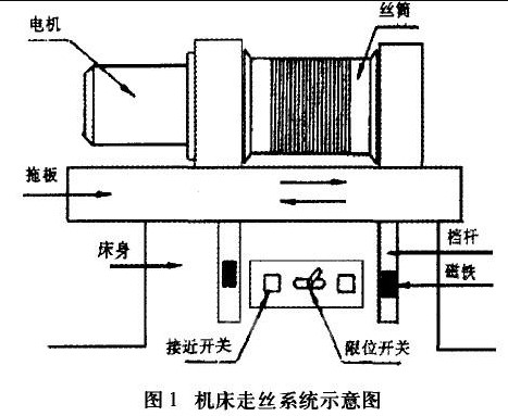 高速線切割機(jī)走絲機(jī)構(gòu)是影響其加工質(zhì)量和加工穩(wěn)定性的關(guān)鍵部件。送絲機(jī)構(gòu)的作用是驅(qū)動(dòng)電極絲以一定的線速度前后移動(dòng),將電極絲整齊地排列在儲(chǔ)線筒上。儲(chǔ)線筒本身的高速正反轉(zhuǎn)是通過電機(jī)的正反轉(zhuǎn)來實(shí)現(xiàn)的。電機(jī)通過聯(lián)軸器帶動(dòng)螺桿筒,再通過同步帶帶動(dòng)螺桿轉(zhuǎn)動(dòng),使滑架往復(fù)運(yùn)動(dòng),通過調(diào)節(jié)換向左右保險(xiǎn)杠之間的距離,即可實(shí)現(xiàn)滑架的移動(dòng)行程。機(jī)床的送絲機(jī)構(gòu)如下所示。