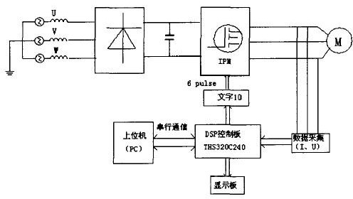 采用數(shù)字信號(hào)處理器作為控制器,可以減少外圍設(shè)備的數(shù)量,提高系統(tǒng)的穩(wěn)定性。在本設(shè)計(jì)中,主要使用了1MS32OC24Ox DSP的PWM輸出端口、板載A/D端口和捕獲接口CAP。DSP的六路PWM信號(hào)經(jīng)緩沖器反相后送到驅(qū)動(dòng)電路板驅(qū)動(dòng)IPM。控制系統(tǒng)結(jié)構(gòu)圖下所示。