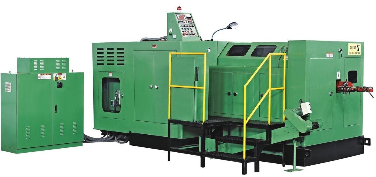 采用冷拉銅,鋁絲,鐵絲等自動冷鐓,是生產(chǎn)抽心鋁鉚釘,半空心鐵鉚釘?shù)膶S迷O(shè)備。該機的全部結(jié)構(gòu)從校直,選料,切割二次成形至落料全部自動進行,具有成形標準穩(wěn)定,加工品種多等優(yōu)點。