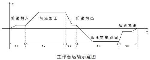 t5段為緩沖區(qū)。返回行程行將完畢,再反向到工作速度之前,為減小對傳動機械的沖擊,應(yīng)將速度降低,之后進入下一周期。頻率:10Hz。